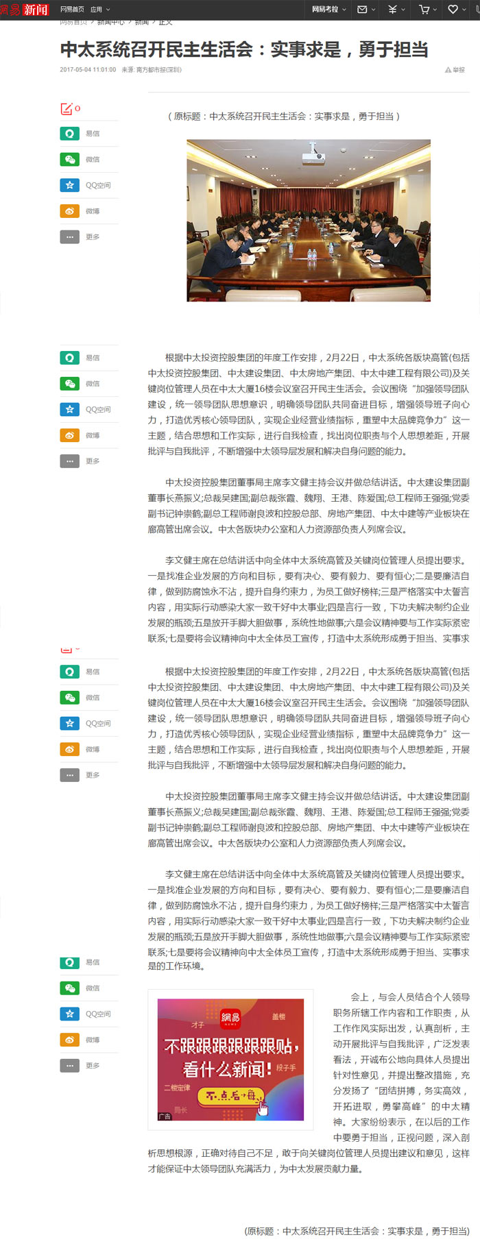 網(wǎng)易新聞報道了“中太系統(tǒng)召開民主生活會:實(shí)事求是,勇于擔(dān)當(dāng)”