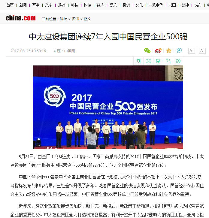 中華網(wǎng)報道了“中太建設集團連續(xù)7年入圍中國民營企業(yè)500強”