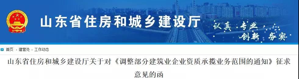 為認真貫徹省政府辦公廳《關于進一步促進建筑業改革發展的十六條意見》(魯政辦字﹝2019﹞53號),切實把有關政策規定落實落地,推動建筑業企業做大做強,現就調整部分建筑業企業資質承攬業務范圍作如下通知: