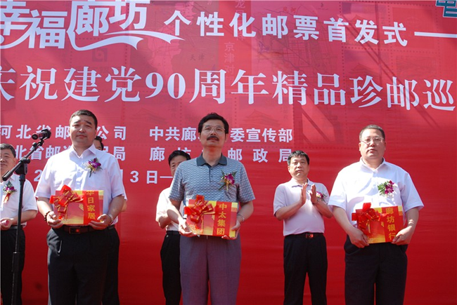 6月3日上午,由廊坊市委宣傳部與廊坊市郵政局共同推出的《黨旗飄揚 幸福廊坊》個性化郵票在廊坊市博物館舉行首發(fā)式。《黨旗飄揚·幸福廊坊》個性化郵票共“1+12”幅圖案。“1”即中心主圖案,體現(xiàn)廊坊市“龍鳳呈祥,京津?qū)ν钡膮^(qū)位優(yōu)勢,“12”即12幅輔圖,其中4幅分別為會展中心、居民小區(qū)、文化藝術(shù)中心、中央生態(tài)城,體現(xiàn)“智能、生態(tài)、商務(wù)、休閑”的廊坊