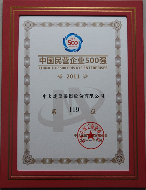 8月25日上午,全國工商聯(lián)在北京召開2011中國民營企業(yè)500強發(fā)布會,發(fā)布2011中國民營企業(yè)500強、2011中國民營企業(yè)制造業(yè)500強名單以及2011中國民營企業(yè)500強分析報告。中太建設集團以1,527,046萬元的營業(yè)收入業(yè)績,排名2011中國民營企業(yè)500強第119位。在河北省民營企業(yè)建筑業(yè)中位列第一。