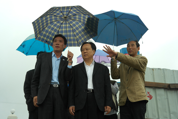 董事局主席李文健(中)在安徽分公司總經(jīng)理陳德剛(左)的陪同下,冒雨視察項(xiàng)目工地